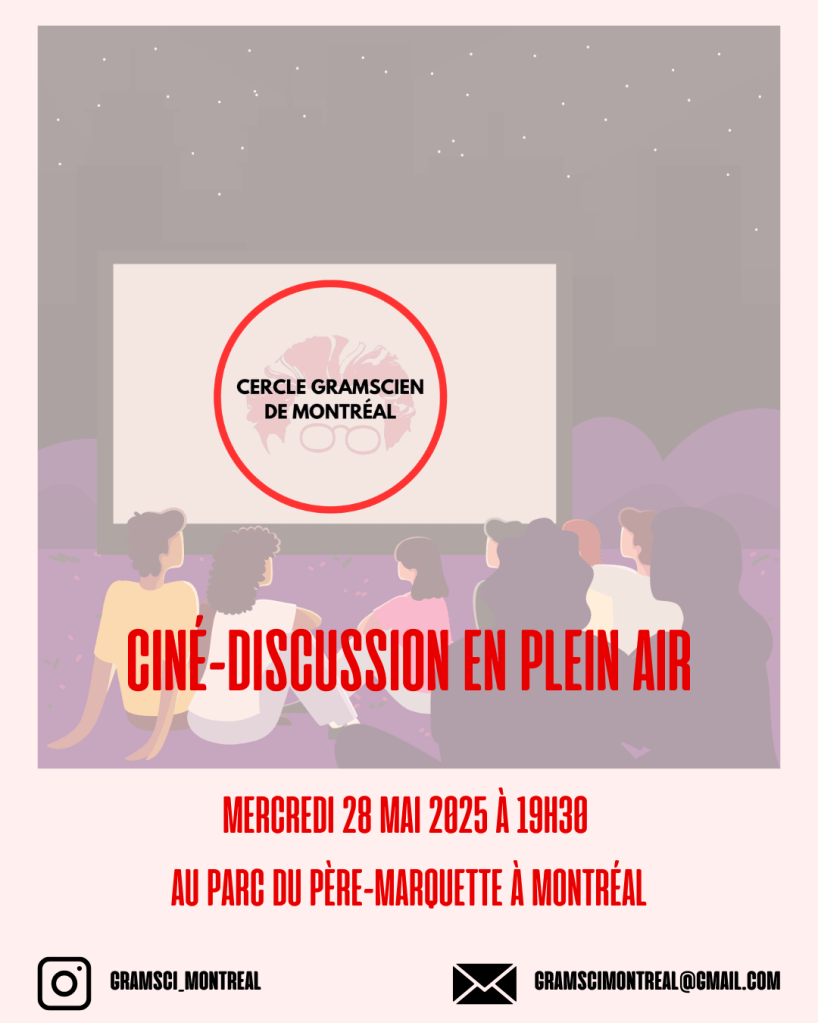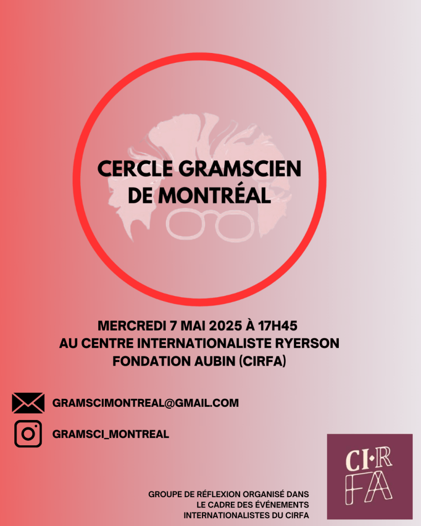 Fondé en janvier 2025, le Cercle gramscien de Montréal (CGM) est un espace d’éducation populaire qui réunit des personnes de divers milieux afin de comprendre et analyser l’actualité québécoise et canadienne en s’appuyant sur les outils théoriques développés par Antonio Gramsci, tout en décloisonnant sa pensée au-delà du cadre universitaire pour la rendre accessible à un public plus large.